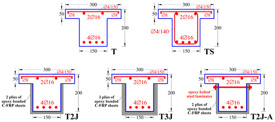 Strengthening of existing low-capacity RC structures using externally bonded fiber-reinforced polymers (EB-FRP) has become very popular because of the advantages of these materials such as their superior strength-to-weight ratio, their easy-to-apply character, their durability and their chemical and corrosion resistance [6,7,8]. For shear-critical RC elements with rectangular cross-sections in particular, full jacketing application of EB-FRP sheets wrapping around the cross-section and along their entire length provides increased strength and enhanced structural performance since it alters the shear brittle response to a ductile one [9,10,11,12]. However, common constructional limitations, such as the existence of a slab, usually prevent the wrapping of EB-FRP sheets around the cross-section. Thus, most RC beams with a T-shaped cross-section are shear strengthened using EB-FRP sheets (jackets or strips) on the three sides of the web of the beam (U-shaped retrofitting). A significant deficiency of this technique is the premature failure of the strengthened member due to the debonding of the EB-FRP at the adhesive composite and concrete interface [13,14,15,16,17,18,19,20].