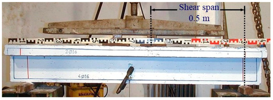 The beams were simply supported on two roller supports 1.20 m apart and tested in monotonic load, as shown in Figure 2. The load applied in a steel distribution beam in order to generate two concentrated loads 200 mm apart in the midspan of the beam as a four-point loading. This way, the ratio of the shear span to the effective depth ratio was equal to a/d = 2.86. The load was imposed consistently in a low rate and was measured by a load cell with accuracy equal to 0.05 kN. Midspan deflection of the tested beams was measured by a linear variable differential transducer with accuracy equal to 0.01 mm. Measurements for load and deflection were read and recorded continuously.
