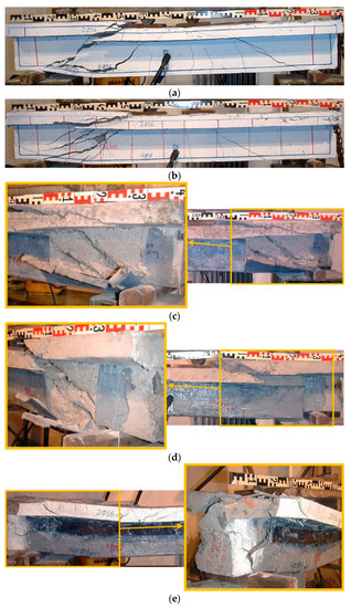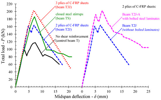 All tested beams exhibited diagonal cracks and eventually failed in a brittle manner due to shear as shown in Figure 3. Figure 3a,b illustrate, in particular, the typical shear cracking of the control beams without transverse reinforcement (specimen T) and with inadequate steel stirrups (specimen TS), respectively. Both beams exhibited typical inclined cracking through the shear span. Figure 3c,d show the failure of the FRP-strengthened beams T2J and T3J, respectively. These beams demonstrated severe brittle diagonal failure right after the debonding of the epoxy bonded C-FRP sheets. The failure of the FRP-strengthened specimen T2J-A with bolted steel laminates is depicted in Figure 3e. Although in this case the concrete diagonal cracking is not visible since it has occurred behind the C-FRP sheets, there is no doubt about the shear failure of the beam obtained. This is based on the fact that the loading bearing capacity of the beam has been abruptly decreasing along with the debonding failure of the C-FRP sheets and the concrete interface. Nevertheless, the installed mechanical anchor delayed the debonding failure and prevented the peeling-off of the C-FRP sheets in specimen T2J-A (Figure 3e), whereas the debonding and the peeling-off of the C-FRP sheets are apparent in specimens T2J and T3J (Figure 3c,d). It is noted that in the study of Bae and Belarbi [44] the application of a sandwich discontinuous mechanical anchorage system succeeded in altering the failure mode of EB-FRP strengthened RC T-beams from debonding to fiber rupture under certain circumstances.