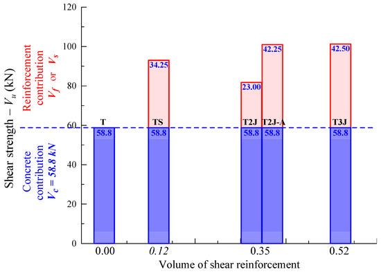 Moreover, the volume of each beam’s shear reinforcement and the corresponding values of the concrete contribution (Vc) and the shear reinforcement contribution (Vf for the beams with C-FRP or Vs for the beam TS with stirrups) to the total shear strength (Vu) are plotted in Figure 5. It is noted that the contribution of FRP sheets to the shear capacity (Vf) is obtained by subtracting the total shear strength (Vu) of the strengthened beams with C-FRP from the shear capacity of the control beam without shear reinforcement (specimen T). The total shear strength of the control beam T represents the concrete contribution (Vc).