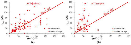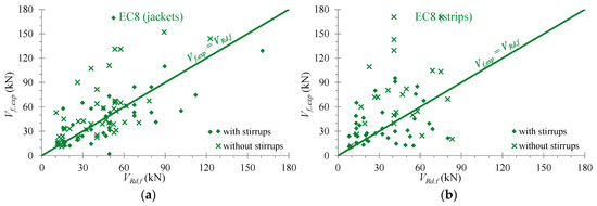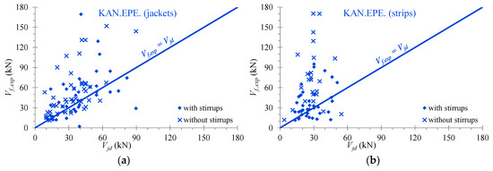 In Figure 6, Figure 7 and Figure 8, the analytical predictions derived from the provisions of the Greek Code of Interventions [41], the Eurocode 8 part 3 [42] and the ACI Committee 440 [43], respectively (denoted as Vjd in “KAN.EPE.”, VRd,f in “EC8” and ϕψfVf in “ACI”) are compared with the test results (Vf,exp) of the EB-FRP contribution to the shear resistance of the examined RC T-beams retrofitted with U-shaped EB-FRP jackets and strips. The diagonal lines signify the design datum (test results are equal to the analytical ones). The design values have been calculated with the safety factors and the area above these lines denotes the safe side.