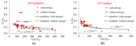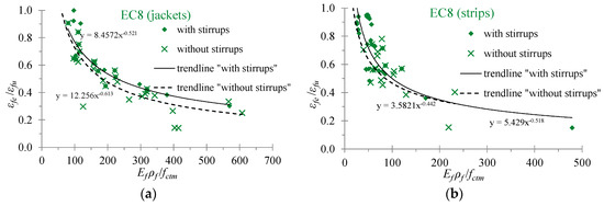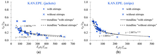 The evaluation of the effective strain in fibers is an important parameter that, in most analytical models, determines the contribution of the EB-FRP to the shear resistance of the RC beams. Furthermore, the ratio of the strains εfe/εfu (effective strain to the ultimate strain of the EB-FRP) indicates the effectiveness of the EB-FRP on the basis that cases of premature debonding failures exhibit low ratio values whereas cases of fiber rupture failures exhibit high ratio values. It is known that the majority of the strengthened T-shaped RC beams with U-wraps of EB-FRP materials fail due to debonding. Figure 9, Figure 10 and Figure 11 display the diagrams of the ratio εfe/εfu versus the amount of the applied EB-FRP in terms of the ratio Ef ρf/fctm. It is noted that the values of the effective strain have been calculated based on the provisions of the Greek Code of Interventions (KAN.EPE.) [41], the Eurocode 8 part 3 [42] and the ACI Committee 440 [43], respectively. The values of the mean compressive strength of concrete, the ultimate strain, the modulus of elasticity and the reinforcement ratio of the EB-FRPs have been taken from the experimental data of the beams examined.
