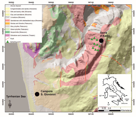 The studied Mn deposit outcrop in the Serra D’Aiello area in the southern boundary of the Amantea Basin sedimentary sequence in Southern Italy is shown in