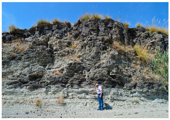 40], as recognized using the following terrains in the TMC: (i) red conglomerates, (ii) sandstone, (iii) cinerites, (iv) fossiliferous conglomerates, (v) arenaceous calcarenites, (vi) clays, and (vii) diatomites at the top of the sequence (deep sea conditions). The Mn deposit outcrops in correspondence to the cyclical arenaceous-clayey alternations, whose total thickness is just under 30 meters, overlies the gray fossiliferous clays (