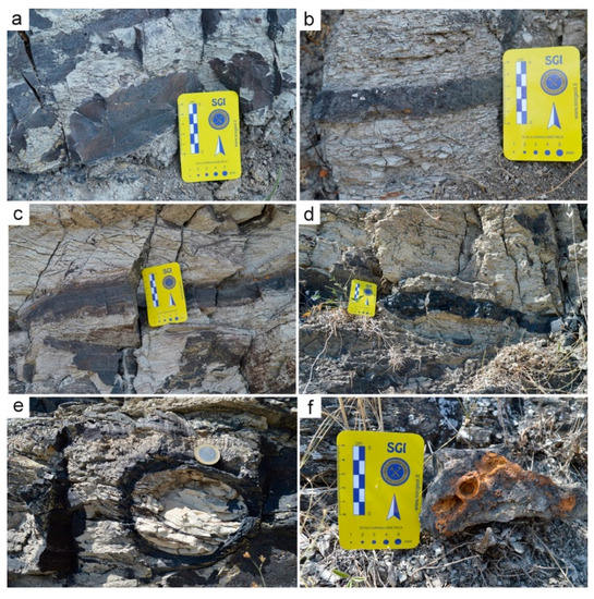 Figure 3f). These were sometimes constituted by nodules and dimensions of less than 3 cm, whereas in others, they formed laminae with a thickness of about 1 cm. Both the layers and the iron oxide nodules were oriented parallel to the direction of the silty layers. The mineralized layers had been affected by a series of faults, bringing them to different heights and constructing a stepped structure.