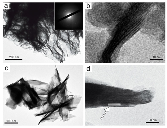 Representative TEM micrograph: (a) aggregates of sheet-like birnessite in sample 4S (the SAED pattern is shown in the inset); (b) detail of (a) where the interlayer of the birnessite structure is indicated by the black arrow; (c) rancièite occurence as elongated platelets (sample 5S), and (d) detail of (c) where the interlayer spacing of rancièite structure of ≈ 8 Å is indicated by the white arrow.