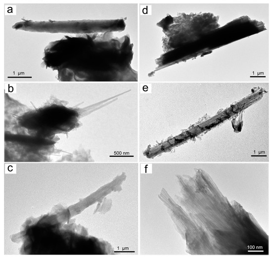 Representative TEM micrograph of the samples examined: (a) fibrous todorokite (sample 1S); (b) thin fibers of todorokite (sample 3S); (c) fibrous todorokite (note the curvature flexibility; sample 7S); (d) fibrous todorokite (cleavage fragment, note the irregular sides; sample 4S); (e) fibrous todorokite (sample 9S); and (f) bundle of todorokite fibers (sample 2S).