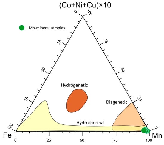 Triangular plot for the genesis discrimination of the Mn deposits.