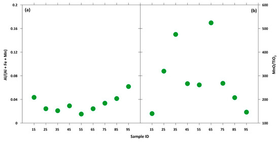 (a) Al/(Al + Fe + Mn) and (b) MnO/TiO2 ratios for each sample.