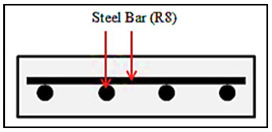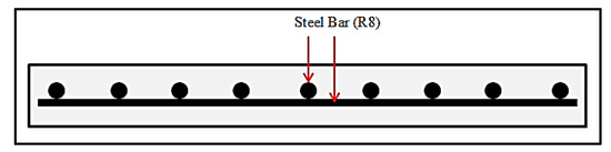 For slab casting, a conventional formwork preparation is required. The formwork is prepared with dimensions of 1000 mm by 530 mm by 25 mm. An 8 mm diameter mild steel round reinforcement bar was fabricated following the design criteria, as shown in Figure 1, Figure 2 and Figure 3 and the height of the concrete cover used is 7 mm. In order to prepare the openings for all nine slabs, the steel reinforcement has been cut as shown in Figure 4, following dimensional length variations of 160 mm by 160 mm, 230 mm by 230 mm, and 320 mm by 320 mm. The mechanical characteristics of cement, reinforcement bar and CFRP used are provided below in Table 1, Table 2 and Table 3, respectively, whereas Table 4 shows the reinforcement bar ratio of the reference RC members.