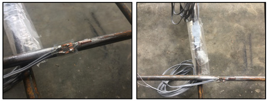 Furthermore, strain gauges (SGs) were also installed on the reinforcement bar of the control slab, as shown in Figure 5. Primarily, the centerline has been marked in the reinforcement bar to provide ease in the attachment of SGs. These SGs were attached to the reinforcement bar using super glue. Additionally, SGs, terminal pads, and the exposed wire were covered with silicone glue in order to avoid contact with water.
