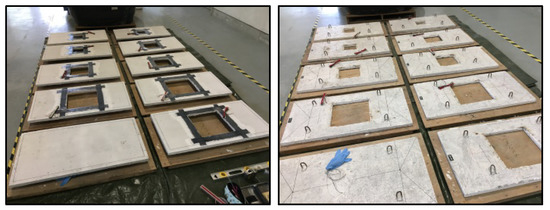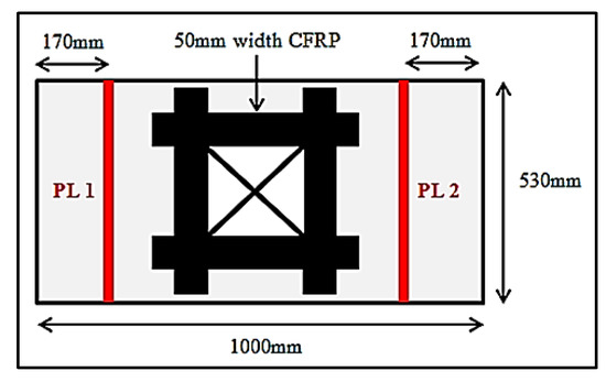 To ensure the desired strength of the prepared concrete, six cylindrical samples (150 mm × 300 mm) were cast to obtain the test results concerning compressive strength, modulus of elasticity and Poisson’s ratio at day 28. An additional three prism samples (100 mm × 100 mm × 500 mm) were cast to determine the flexural strength of the concrete and subsequently tested for a two-point load system. Afterward, concrete was poured inside the formwork, and the surface of the slab was flattened to ensure a smooth surface finish. Before pouring concrete, the inner part of formwork was greased to provide ease in its removal. The casted samples were then cured for 28 days. Later, CFRP sheets were attached to the slab soffits using epoxy glue as shown in Figure 6. The CFRP sheets were sandwiched between layers of epoxy glue for 24 h to ensure its sufficient bonding strength. As the epoxy glue dried utterly, slabs were painted in white color (except the CFRP region) to ensure the easiness of identifying the crack line on its surface during the testing phase. Lastly, rosettes were attached on the CFRP sheet surface using superglue (dried for 30 min) at 45° for better configuration in all nine slabs with openings as shown in Figure 7. Figure 8 defines the marking of these slab surfaces for two-point load tests at the defined position.