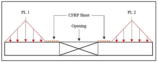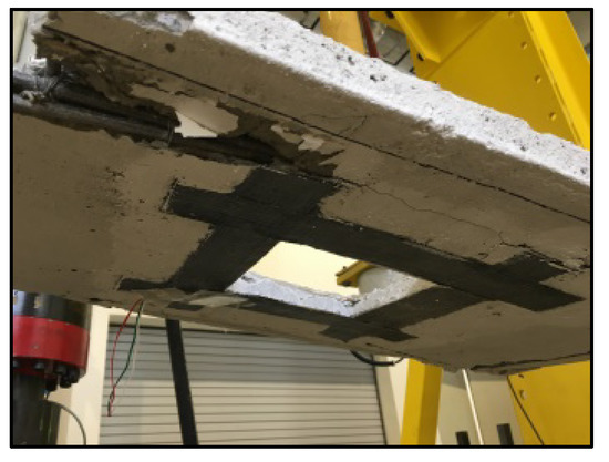 CFRP materials, currently produced in different configurations, are widely used for the strengthening and retrofitting of concrete structures [12,27]. Recently, research has been directed to characterize the use of CFRP sheets as a flexural reinforcement for strengthening applications. In the study done by [28], CFRP sheets were used as the strengthening material to improve the shear capacity of concrete slabs [29]. It was observed that the CFRP has increased the flexural stiffness and improved the punching shear strength of the slabs. The increase in the flexural capacity has modified the failure from a pure flexural mode to a combined flexure-shear mode or pure punching shear mode [30]. By efficiently binding the CFRP layers to the tension face of slabs, the flexural resistance of the two-way slab can be strengthened. This method of flexural strengthening offers different benefits: minimization of structural expansion and its weight, ease of handling on-site, and excellent resistance to corrosion [31,32]. The connection between concrete and CFRP composite reinforcement at the interface has an important effect on the overall performance of the reinforced framework because the CFRP sheets are attached to the concrete framework. Fewer research was, however, carried out on slab with openings [30,33,34].
