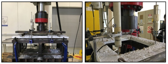 RC slabs are considered as supported on all sides as they were placed on top of the frame (950 mm by 470 mm). Two-point loading system was applied at 170 mm from both ends of the slab, up to failure, as shown in Figure 9. Figure 10 shows the uniformly varying load configuration adopted for all slabs tested. The applied force was controlled by the loading cell, directly connected to the loading instrument. The purpose behind SGs installation was to obtain the reinforcement strain data due to the applied loads. Likewise, the strain rosette was installed to measure the normal strains along with different directions on the underlying surface as shown in Figure 7. On the other hand, the deflection was measured using LVDT, placed at every corner of the opening on each slab as shown in Figure 11. However, in the control slab, it was placed only at its center. Dynamic Machine (capacity up to 500 kN) with 0.5 kN/s test speed was utilized for the testing of slabs and to measure its deflection behavior. The attained test results were analyzed and discussed in the later section.