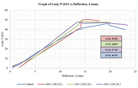 Based on the graphs provided below, it shows that slabs with three layers of the CFRP sheet can take a higher load as compared to the slab with only one layer of the CFRP sheet. By taking the number of layers of the CFRP sheet as a variable, the deflection is lower when the load is higher. On the other hand, by taking the size of the opening as the variable, the load is proportional to the deflection. This is due to the heavyweight of the slab with a larger surface area and smaller opening size.