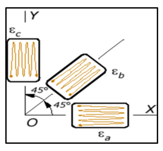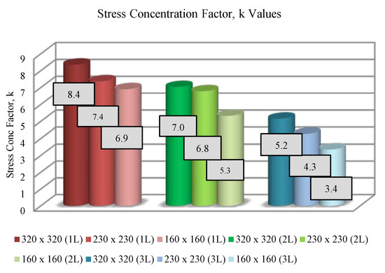 A stress concentration factor (k) is a dimensionless factor that is used to quantify how concentrated the stress is in material, and it is defined as the ratio of the highest stress in the element to the reference stress. Reference stress is the total stress within an element under the same loading conditions without the stress concentrators, meaning the total stress on the material where the material is free from flaws such as holes, cuts, shoulders, or narrow passes. Figure 18 shows the results of the stress concentration factor for all nine slabs tested and the values have been calculated using Equations (2) to (11). Aside from that, Figure 19 shows the labeling on rosette strain gauge for the reading of εa, εb, and εc values.