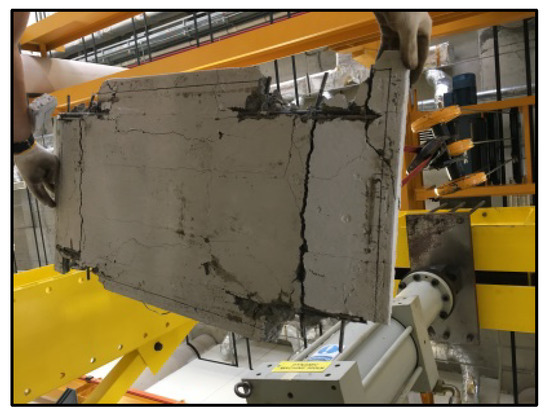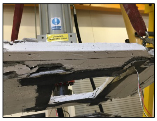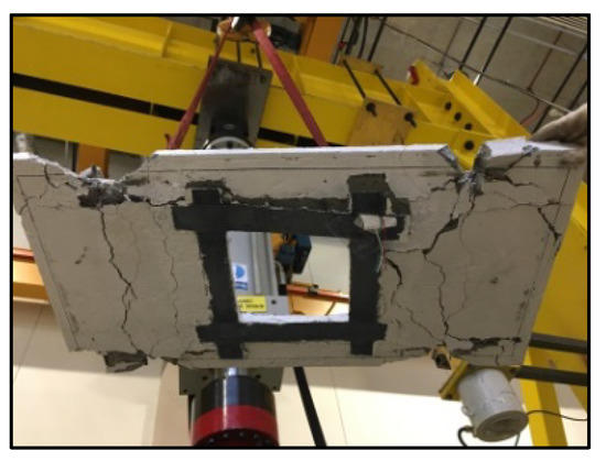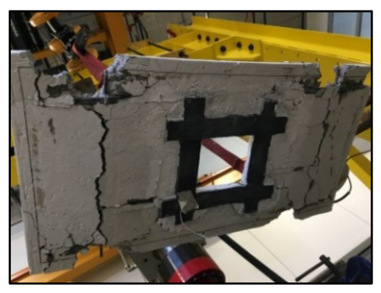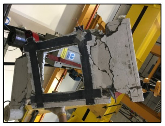 Furthermore, it is observed that cracking stopped until it reached the CFRP sheets, as shown in Figure 21, Figure 22 and Figure 23. Based on the experimental test, the worst part of the slab that failed was at the point where the two-point loads and frame support were perpendicular to each other. Referring to Figure 23, this condition can be explained in such a way that both the frame and the two-point loads exerted pressure on one another as the load increased, hence causing the slab to fail badly at that particular point. In smaller opening sizes, the cracks spread more commonly as compared to the bigger size of the opening. The reason for such a condition is because the slab with a smaller opening has a larger surface area for the crack to propagate as compared to a slab with a larger opening, which has a lesser surface area. Hence, the deflection is lesser, and therefore, the cracks appeared to be narrower. However, it can be concluded that the size of opening, the number of CFRP layers, and the location of the point loads influenced the cracking and yield lines pattern.