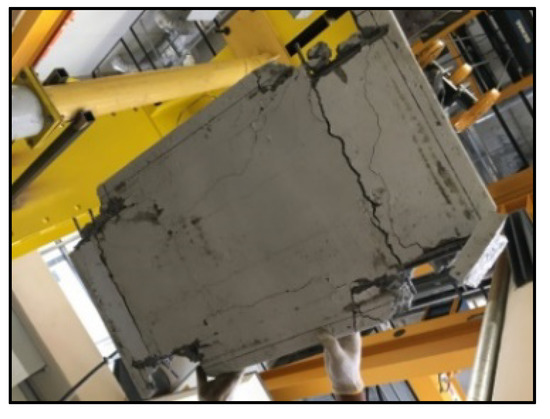 For each slab, it is observed that the first crack started to appear near the point loads due to the high concentration of stress at both points, as shown in Figure 20, Figure 21, Figure 22 and Figure 23. As the applied load increases, the crack propagation continued to increase. In contrast, some researchers stated that the first crack appeared diagonally near a corner due to the openings. For the control slab, it was observed that the crack propagated from two points until it reached the middle part of the slab as shown in Figure 20. This is in contrast with other research papers that stated the first crack of a homogenous slab appears in the middle of the slab. The difference is deduced due to the position and the number of point load used for this particular experimental study. Other than that, the load configuration adopted for this experiment is uniformly varying load (UVL), meaning that the load is spread over the slab in such a manner that the rate of loading varies from each point along with the slab. Therefore, the load is zero at one end and increases uniformly to the other end. This type of load is known as a triangular load. On the contrary, based on previous research studies, most researchers experimented by adopting a uniformly distributed load (UDL) during the testing.