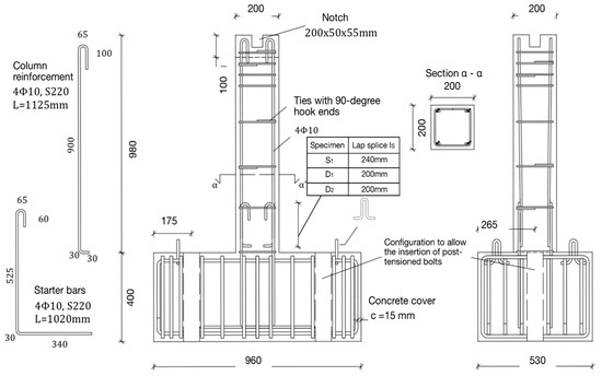 The present study aims to experimentally and analytically investigate the effectiveness of CFRP jacketing system in improving the load transfer mechanism between the lap-spliced reinforcing bars of substandard columns, to allow for steel yielding and the development of the column’s nominal flexural moment capacity. Thus, an experimental program was conducted for three cantilever column specimens of 1:1.5 scale. The original specimens (S1, D1 and D2) were representative of columns found in typical pre 1960s–1970s RC structures, namely with concrete of low compressive strength, plain steel reinforcement S220, transverse reinforcement consisting of ties with ninety-degree hook ends spaced at 200 mm and lap splices of reinforcement with inadequate length equal to twenty-four-times (specimen S1) or twenty-times (specimens D1 and D2) the bar diameter. Dimensions and cross-section details of the specimens are illustrated in Figure 1. The reinforcements of the specimens were inserted into wooden molds, while subsequently the concrete was poured and vibrated. The concrete compression strength of the specimens was measured by using 150 × 300 mm cylinder compression tests. The strength values after twenty-eight days are shown in Table 1.