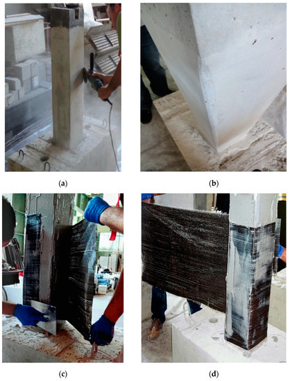 Retrofit process. (a) Smoothing of the circumferential column surface; (b) curving of the column edges; (c) wrapping of the first layer of CFRP textile—full integration of the textile to the resin matrix; (d) wrapping of the second layer of the CFRP textile.