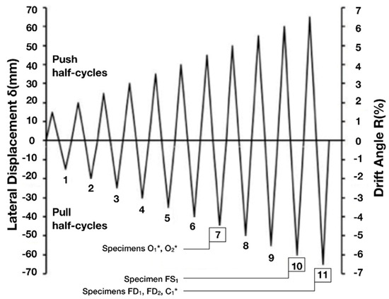 The seismic loading sequence was established to capture critical issues of the element capacity—for instance, the ultimate limit state of the column. Given that the inelastic deformations cause cumulative damage, while the behavior of the column is mainly demonstrated by the envelope curves, a constantly ascending lateral displacement history with one cycle per amplitude of displacement was adopted, without considerable influence on the seismic performance of the specimens. An original specimen was used to determine the steps of the earthquake-type loading and was at first loaded to its yield displacement, after which a significant decrease in stiffness occurs. This was measured from the plot of the resisted shear force-versus-displacement of the specimen, while it was also verified by the yielding of the longitudinal column reinforcement using strain gauges. The loading was continued in the same direction (push cycles) to 1.5 times the yield displacement and the specimen was subsequently unloaded and loaded in the other direction (pull cycles) to the same lateral displacement. After the first cycle of loading, the maximum displacement of each subsequent cycle was increased incrementally by 0.5 times the yield displacement [23,24,25].