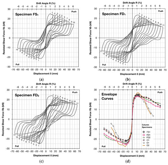 Plots of resisted shear force-versus-displacement of the strengthened column specimens, (a) FS1, (b) FD1, (c) FD2 and (d) envelope curves. Specimens O1, O2 and C1 were tested previously [1].
