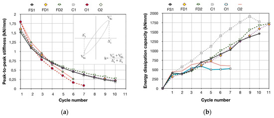 (a) Peak-to-peak stiffness and (b) energy dissipation capacity of the CFRP-strengthened specimens FS1, FD1 and FD2 with respect to specimens O1, O2 and C1 [1].