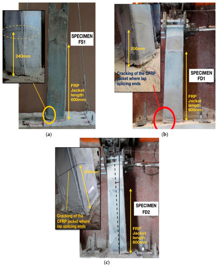 The original specimens (S1, D1 and D2) were designed with poor seismic details in order to be similar to specimens O1 and O2, which were representative of columns found in pre 1960s–1970s RC buildings and were tested in a previous work of Kalogeropoulos and Tsonos [1]. In particular, D1 and D2 were similar to specimen O1, while S1 was similar to specimen O2. Therefore, the efficiency of the strengthening scheme, applied to the pre-earthquake strengthened columns FS1, FD1 and FD2, was also evaluated with respect to the hysteresis performance of the original specimens, O1 and O2, as shown in Figure 5d. The latter exhibited brittle premature lap-splice failure, followed by excessive bar slipping and the rapid degradation of lateral strength, peak-to-peak stiffness and energy dissipation capacity, while finally collapsing due to the loss of axial load carrying capacity. Contrariwise, the CFRP jacketing of specimens FS1, FD1 and FD2 provided additional confinement to the critical region of the columns, while improving the load transfer mechanism between the lap-spliced reinforcement. Hence, the overall hysteresis behavior of the strengthened columns with the CFRP jacket was improved and was close to the cyclic response of the control specimen C1, which had continuous bars without lap splices and was also tested previously, as shown in Figure 5d [1].