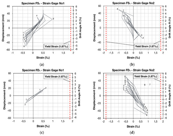 Along these lines, electrical resistant strain gauges were attached to the lap-spliced bars of the column specimens to allow for the monitoring of steel strain variations during the earthquake-type loading and to ascertain if the yielding of the bars was achieved. The exact location of each strain gauge is presented in Figure 10, while in Figure 8 and Figure 9, the plots of the load point displacement-versus-strain of reinforcement and the plots of maximum steel strain per cycle of loading are illustrated, respectively. Consequently, critical information about the specimens’ responses during the reversed inelastic lateral deformations was provided. In particular, strain values lower than the yielding strain of the S220 reinforcing bars were measured in the case of the strengthened specimens FS1 and FD1, which were retrofitted by wrapping one layer of CFRP textile around the critical column region, as shown in Figure 8a–d and Figure 9a,b. Thus, from the measurements of the strain gauges, it was demonstrated that the confinement provided by the CFRP jackets of specimens FS1 and FD1 was insufficient to allow for the yielding of the lap-spliced bars. Contrariwise, the continuously increasing steel strain values during consecutive cycles of the loading of specimen FD2 indicate the absence of bar slipping [29], while the measured strain significantly exceeded the steel yielding strain 1.87‰, as shown in Figure 8e,f and Figure 9c. This clearly demonstrated the satisfactory enhancement provided by the CFRP jacket of specimen FD2.