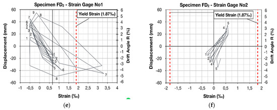 Plots of displacement-versus-strain measured by strain gauges which were attached on the steel bars of specimens FS1 (a,b), FD1 (c,d) and FD2 (e,f).