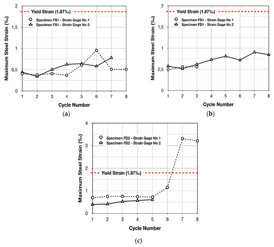 Maximum steel strain values of (a) specimen FS1, (b) specimen FD1 and (c) specimen FD2.