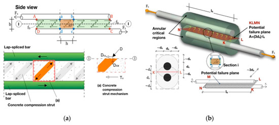 (a) Forces acting in the lap splice region through section I-I from the concrete compression strut mechanism; (b) annular critical regions and potential failure plane (KLMN).
