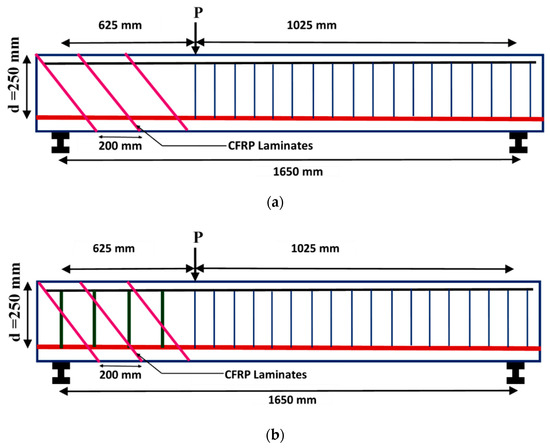 Schematic of loading details for NSM shear strengthened PSC beams. (a) Beams with no stirrups (in the test region); (b) Beams with stirrups (in the test region).