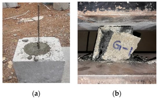 Sample preparation and compression behavior of bonding materials. (a) Prepared sample for bond test; (b) Compression tests on mortar cubes.