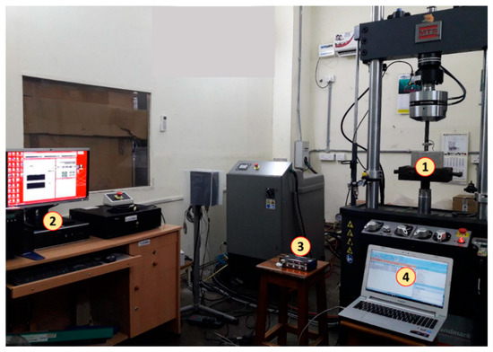 Test setup and instrumentation for bond tests. Components: (1) Test specimen, (2) Controls system, (3) DAQ, (4) Operating system.
