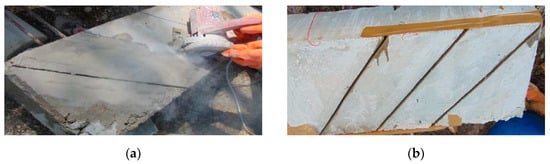 NSM shear strengthening was carried out as per ACI 440.2R provisions [39]. The laminates were oriented at an angle of 45° as it was found to be the most efficient orientation in the previous studies [5,11,12,13]. The dimensions of grooves were prepared not lesser than 1.5 times the dimensions of reinforcing materials used [39]. The grooves dimensions used were 30 mm × 3 mm. The grooves were cleaned using high jet water spray to drive out the dust particles. After thorough cleaning, primer resin was applied on the surface (hardener: base = 1:2) to improve the bond efficiency. Thereafter, the bonding materials were prepared and transferred into the grooves. The bonding material used were two component-based epoxy resin, HSCG and the GP mortar. The CFRP laminates were pressed against the bonding materials and then the surface finishing was carried out. After a minimum curing period of seven days, the specimens were tested as presented in the subsequent sections. The systematic procedure for NSM strengthening is shown in Figure 7.