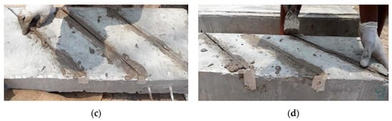 Step by step procedure for NSM strengthening of PSC beams. (a) Grooving of PSC beams; (b) Primer application in grooves; (c) Placing the bonding materials and (d) Pressing CFRP laminates on grooves.