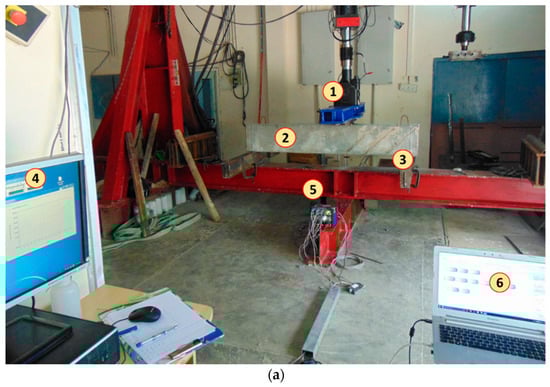 Test setup and Instrumentation details under shear loading. (a) Test setup for shear loading; (b) LVDT’s for principal strain and (c) LVDT’s for curvature measurement. Components: 1. 250 kN MTS actuator; 2. Test specimen; 3. Support beam; 4. Controls system; 5. DAQ system; 6. Operating system.