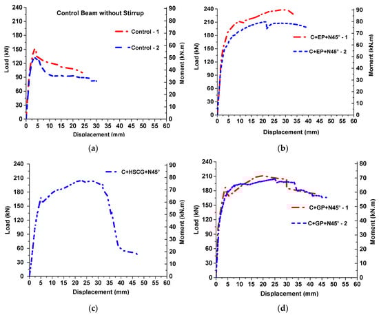 Load—Displacement behavior of stirrup beams with bonding materials. (a) Control beam; (b) Epoxy bonded specimen; (c) HSCG bonded specimen and (d) GP bonded specimen.