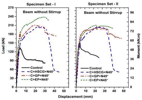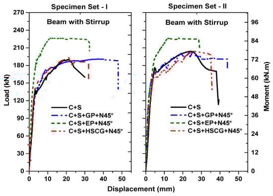 The overall behavior of PSC beams is illustrated in Figure 11 and Figure 12. In figures, set I and II refers to two similar specimens tested under same series. The results are presented to avoid for easy understanding. NSM strengthening with different bonding materials was highly effective in improving the peak resistance of PSC beams without vertical stirrups. Moreover, the strengthening also contributed to the improvement of ultimate displacement and converting the failure mode from predominantly shear to flexure (except HSCG mortar). HSCG mortar did not possess sufficient resistance in preventing the shear cracks propagating through them and resulting in failure of specimens in a diagonal shear tension failure mode. Epoxy resin exhibited excellent bonding properties, thus improving the overall behavior in terms of strength and ultimate displacement by 56.2% and 35.6, respectively. GP mortar also had adequate resistance in restraining the shear crack and converted the failure mode from diagonal shear tension to flexure. The provision of stirrups in the beam has provided enough shear resistance and helped in converting the failure mode from diagonal shear tension mode to flexure mode. It is worth mentioning that the presence of stirrups contributed to the shear resistance of the beam making the NSM strengthening scheme somewhat less efficient. The NSM strengthening using inorganic bonding materials produced marginal improvement in strength. However, the GP mortar had good shear resistance converting the shear failure to flexure and thereby having increased displacement at the failure by 32.2%. The NSM strengthening using epoxy improved the strength by about 14.8% with the reduction in the ultimate displacement of 14%.