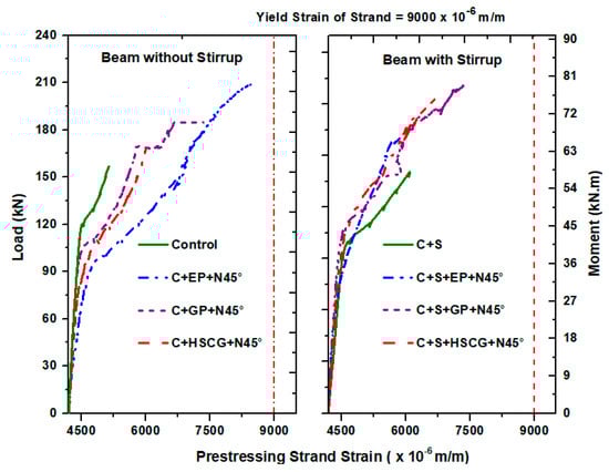 The behavior of load–strand strain of PSC beams with and without vertical stirrups is shown in Figure 13. The prestressing strands used do not possess a well-defined yield point. Hence, the value of yield strain is considered to be 9000 µm/m [5,6,7]. The initial strain measured during the pre-tensioning process was found to be 4200 µm/m. The control specimen which do not have any stirrups in the test zone had a strand strain of about 7500 µm/m. It is clear from Figure 13, that the strands in control specimens with different bonding materials had the failure strain value close to the yield strain of prestressing strands. This is due to the effective contribution of strands and FRP laminates under shear. Their contribution reduces due to the presence of stirrups which is highly significant under shear than the strands and FRP. It is worth mentioning that the prestressing strands did not reach the yield strain in none of the specimens due to the predominant shear dominant behavior.