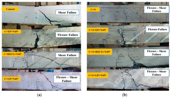 Failure mode of beams with different bonding materials. (a) Beams with no stirrups and (b) Beam with stirrups.