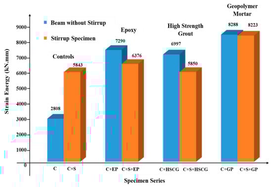 The value of energy absorption for the specimens can be calculated by integrating the area under the load-displacement curve until the ultimate displacement. The strain energy absorption of beams with different bonding materials is compared in Figure 16. The value of stiffness at the level of cracking can be determined from the ratio of the cracking load to the displacement at the same load. The values of energy absorbed and stiffness at cracking are documented in Table 3. The control specimens with shear reinforcement had energy absorption of about two times that that of the beams without vertical stirrups. This is mainly due to the change in failure mode from brittle shear to ductile flexure-shear as a result of the effective contribution of shear reinforcement. This is vice versa in the case of NSM shear strengthened specimens. It also signifies that NSM CFRP laminates become less efficient when the stirrups are provided in the shear dominant zone. It is worth mentioning that the provision of shear reinforcement (stirrup) was alone able to prevent the diagonal shear failure. Thus, the contribution of NSM laminates shear resistance is expected to reduce in the beams with stirrups. The specimens with GP mortar as the bonding material had a better value of cracking stiffness than the other bonding materials.