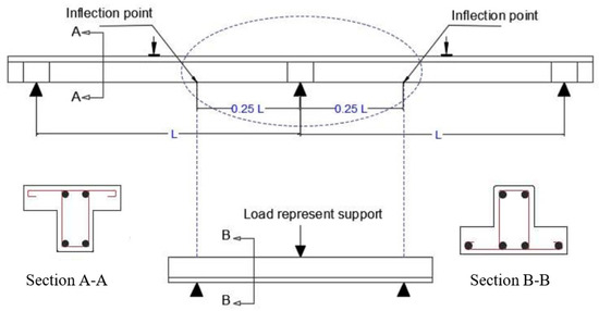 To evaluate the CFRP strengthening of the positive and negative moment regions, the T-beams were tested under three-point bending as shown in Figure 7. The negative region was tested using an inverted T-beam, with the inflection points represented by the end supports and the internal column was represented by the applied midspan loading (Figure 1, Figure 2 and Figure 7b).