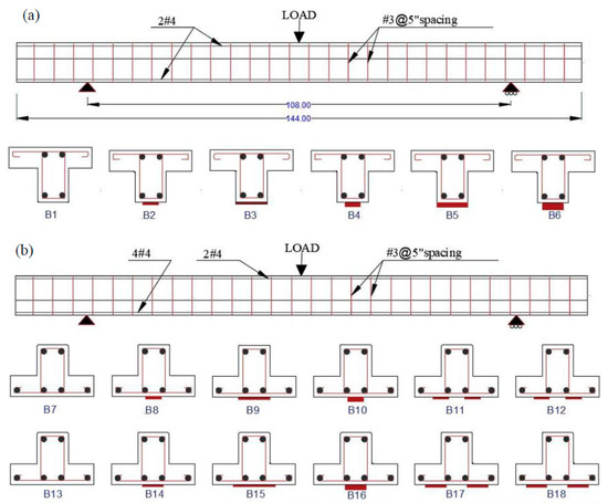 Externally bonded carbon fiber reinforced polymer (CFRP) sheets are considered as an effective technique for strengthening and repairing reinforced concrete (RC) beams [1,2]. The need to strengthen concrete structures for shear or flexure may arise because of initial design or construction errors, design code updates, deterioration during service life, fires, or earthquakes. The replacement of deficient structures may be considered; however, this requires large investments. Thus, strengthening the structures for flexure and shear has become one of the favorite ways for improving the load-carrying capacity and prolonging the service life of concrete structures. Several researchers [3,4,5,6] have investigated shear strengthening by using fiber reinforced polymer (FRP) sheets, ropes and other strengthening techniques such as using FRP or mortar jacket. Some of these studies provide promising results, as it changes the mode of failure from brittle to ductile failure; it was also found that the shear capacity of the strengthened beams was increased compared to the un-strengthened beams. Other researchers have studied the flexural strengthen of the RC beams; Lamanna, et al. [7] proposed a new method for strengthening RC T-beam for flexure. They attached the FRP strips to the RC beams by using mechanical fasteners which was found to increase the moment capacity in addition to greatly increase the ductility of the strengthened beams. Chellapandian et al. [8], investigated experimentally and analytically the effectiveness of different strengthening techniques in improving the flexure behavior of RC beams. NSM, external bonding (EB) strengthening with a CFRP sheet, or hybrid strengthening, which uses a combination of NSM CFRP laminate and EB CFRP confinement, were tested. It was found that hybrid FRP strengthening significantly increases the capacity of the strengthened beams. Also, it was found that beams strengthened with hybrid FRP strengthening showed higher energy absorption capacity than other strengthened beams.