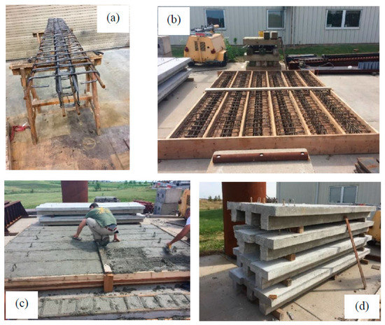 Casting of the T-beams: (a) steel reinforcing cage, (b) formwork with the reinforcement cage, (c) T-beams during casting, (d) T-beams removed from their formwork.