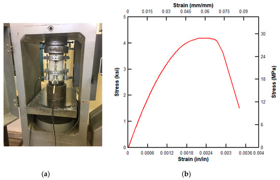 Concrete cylinder compression testing: (a) test set-up, (b) typical stress–strain relationship response.