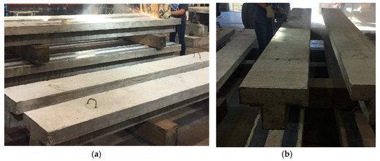 Surface preparation: (a) the inverted T-beam before lifting hooks were removed; (b) concrete surface grinding.