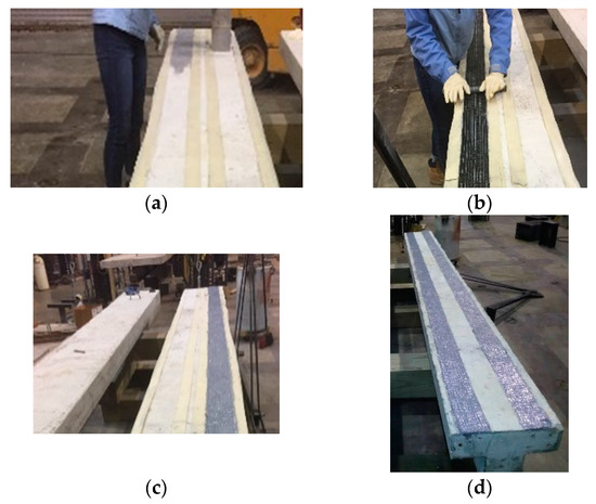 The steps in T-Beam strengthening: (a) applying the first layer of epoxy; (b) adding the CFRP sheet; (c) adding the second layer of epoxy; (d) the final shape.