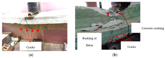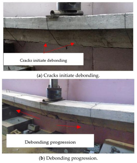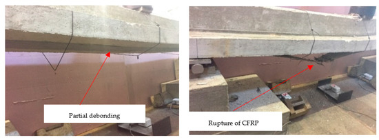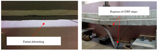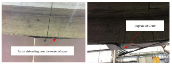 As the applied load increased towards failure, several localized drops in capacities of the CFRP-strengthened beams were recorded until complete failure (Figure 9). This could be attributed to the gradual debonding failure associated with concrete cracks. Debonding was mainly characterized by failure of the bond layer between the CFRP and the concrete. In some cases, debonding was also accompanied by the partial failure of the concrete cover. As the loading of the beams progressed, debonding occurred at different locations along the span.